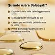 Balaayah si assorbe rapidamente e non lascia macchie o residui oleosi se utilizzato come indicato sulla pelle umida e lasciato assorbire prima di vestirsi.